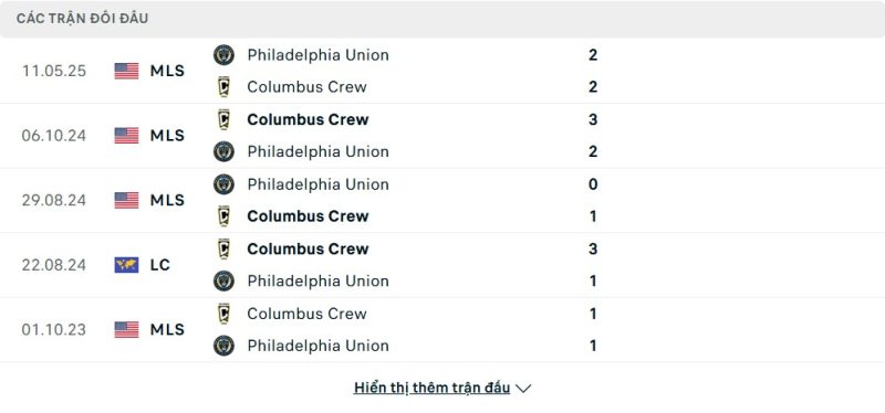 Thành tích đối đầu của Columbus Crew vs Philadelphia Union