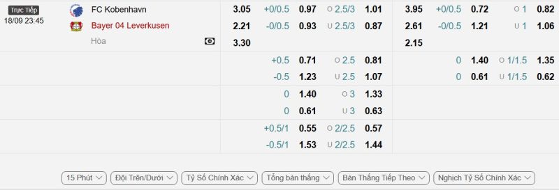 - Kèo tỷ số bóng đá hiệp 1: Copenhagen 0-2 Bayer Leverkusen