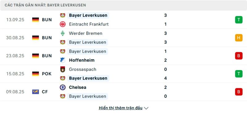 5 trận gần nhất của Bayer Leverkusen: W-D-L-W-L