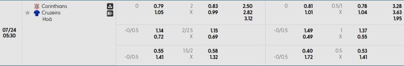 Bảng Tỷ lệ kèo bóng đá Corinthians vs Cruzeiro
