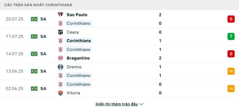 5 trận gần nhất của Corinthians: L-W-L-D-D