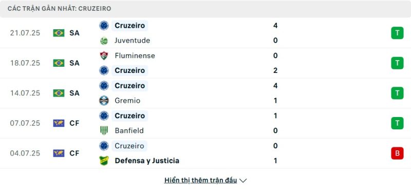 5 trận gần nhất của Cruzeiro: W-W-W-W-L