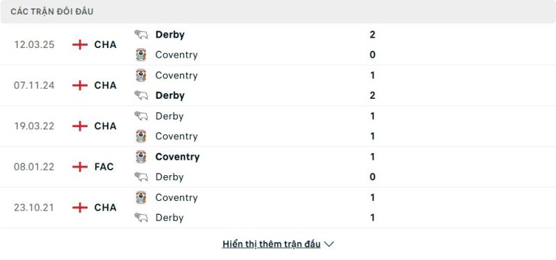 Thống kê phong độ gần đây Derby County vs Coventry City