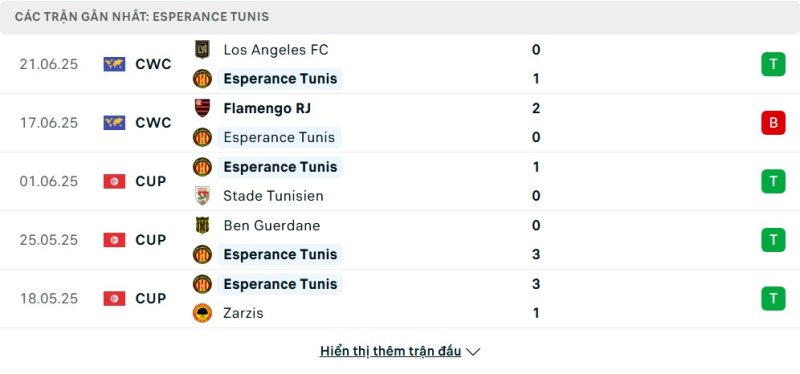 5 trận gần nhất của Espérance de Tunis: W-L-W-W-W