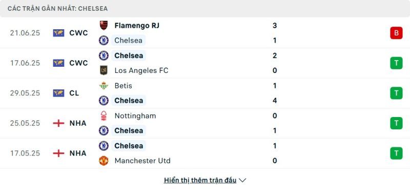 Thống kê phong độ gần đây Espérance de Tunis vs Chelsea