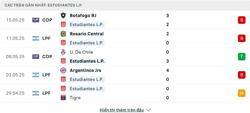 5 trận gần nhất của Estudiantes de La Plata: L-L-W-L-D