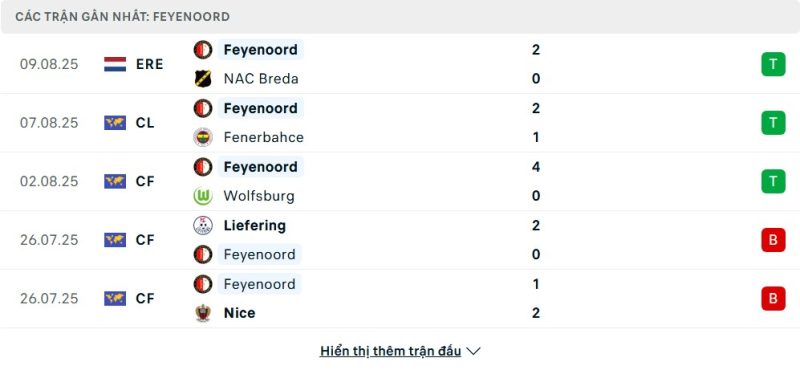 5 trận gần nhất của Feyenoord: W-W-W-L-L
