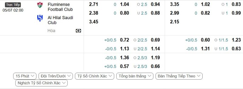 - Kèo tỷ số bóng đá hiệp 1: Fluminense 0-2 Al-Hilal