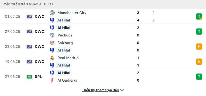 5 trận gần nhất của Al-Hilal: D-W-D-D-W