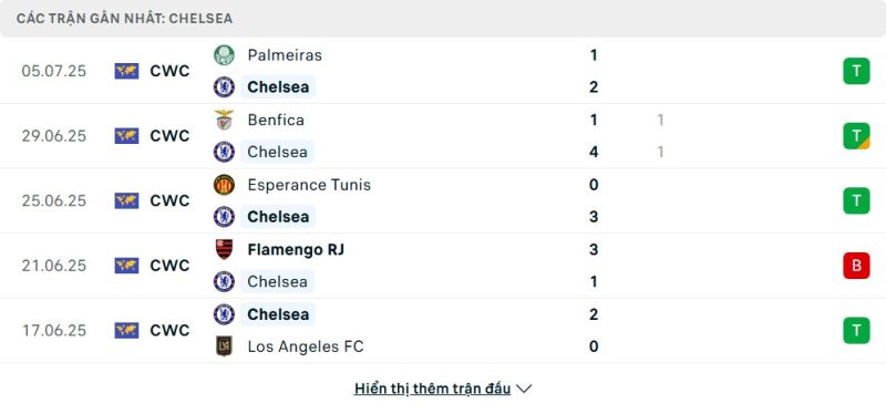 Thống kê phong độ gần đây Fluminense vs Chelsea