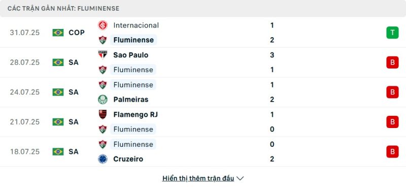 5 trận gần nhất của Fluminense: W-L-L-L-L