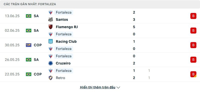 5 trận gần nhất của Fortaleza: L-L-L-L-D