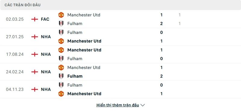 Thống kê phong độ gần đây Fulham vs Manchester United
