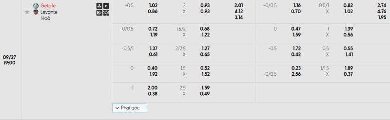 Bảng Tỷ lệ kèo bóng đá Getafe vs Levante