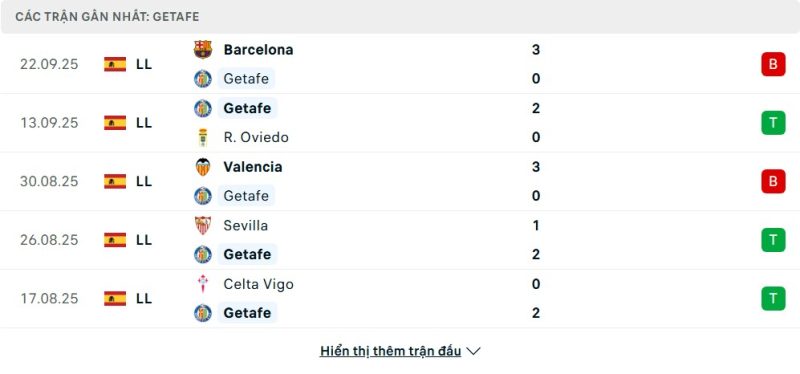 Thống kê phong độ gần đây Getafe vs Levante