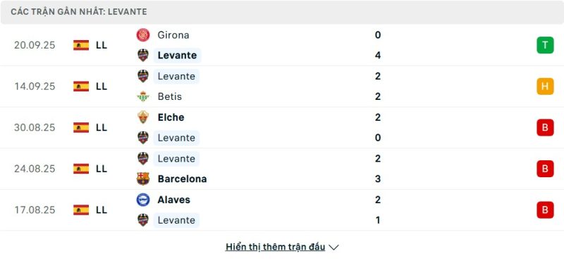 Bên kia chiến tuyến, Levante lại đang gặp nhiều khó khăn hơn trong giai đoạn đầu mùa giải. Đội khách đang xếp ở nửa dưới bảng xếp hạng, cụ thể là vị trí thứ 16 với chỉ 4 điểm sau 5 vòng đấu. Chuỗi 3 trận thua liên tiếp trước Alavés, Barcelona và Elche đã đẩy họ vào tình thế khó khăn. Tuy nhiên, điểm sáng lớn nhất của Levante chính là chiến thắng tưng bừng 4-0 trước Girona ở vòng 5 và trận hòa 2-2 với Real Betis. Điều này cho thấy hàng công của họ vẫn có khả năng bùng nổ đáng gờm dù phong độ chung chưa thực sự ổn định.