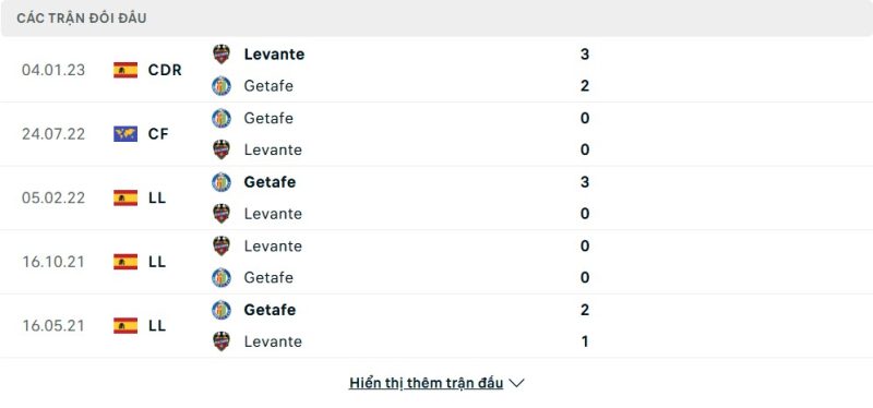Thành tích đối đầu của Getafe vs Levante