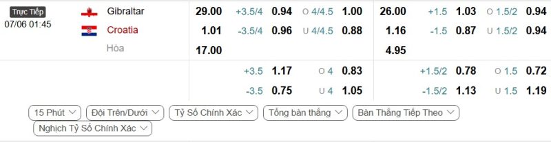 Bảng Tỷ lệ kèo bóng đá Gibraltar vs Croatia