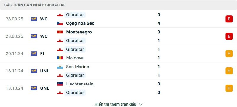5 trận gần nhất của Gibraltar: L-L-D-D-D