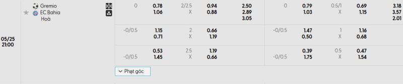 Bảng Tỷ lệ kèo bóng đá Grêmio vs Bahia