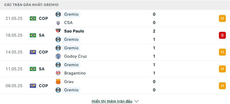 5 trận gần nhất của Grêmio: D-L-D-D-D