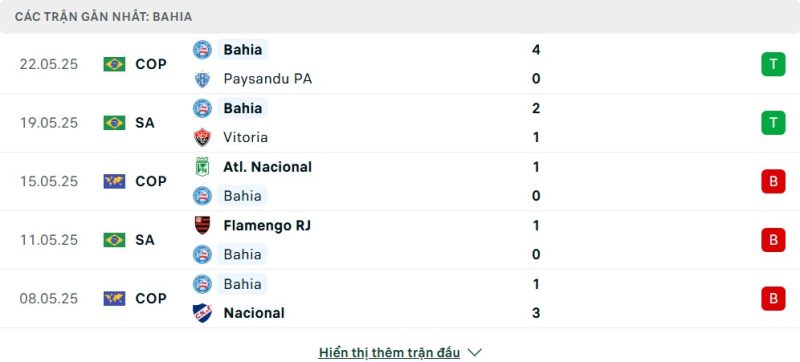 5 trận gần nhất của Bahia: W-W-L-L-L