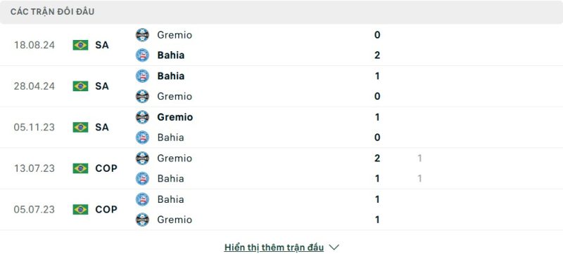 Thành tích đối đầu của Grêmio vs Bahia