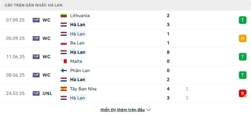 5 trận gần nhất của Hà Lan: W-D-W-W-D