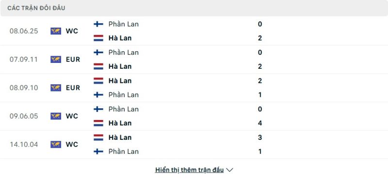 Thành tích đối đầu của Hà Lan vs Phần Lan