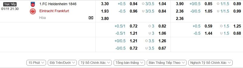 • Kèo tỷ số bóng đá hiệp 1: 1. FC Heidenheim 2-2 Eintracht Frankfurt