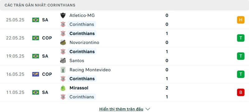 5 trận gần nhất của Corinthians: D-W-W-W-L