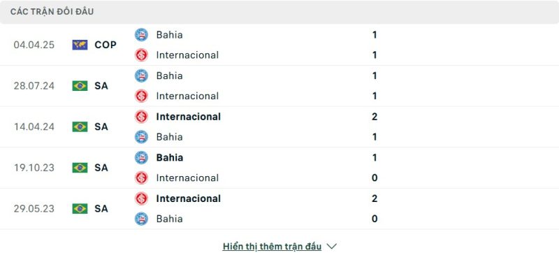Bảng Tỷ lệ kèo bóng đá Internacional vs Bahia