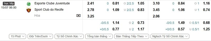 Bảng Tỷ lệ kèo bóng đá Juventude vs Sport Recife