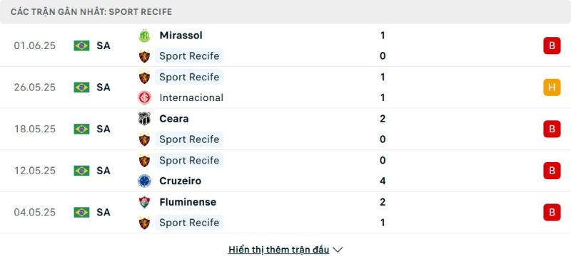 5 trận gần nhất của Sport Recife: L-D-L-L-L
