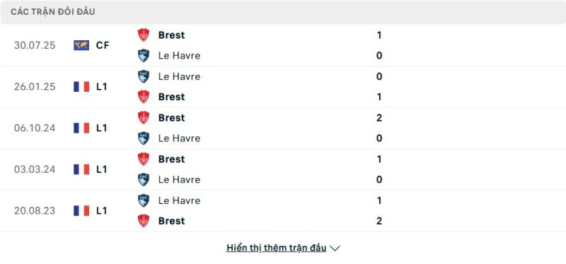 Bảng Tỷ lệ kèo bóng đá Le Havre vs Brest
