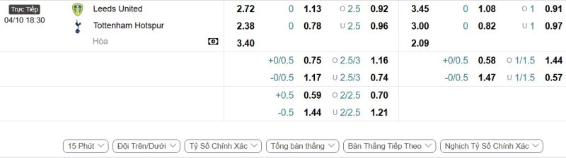 Bảng Tỷ lệ kèo bóng đá Leeds United vs Tottenham Hotspur