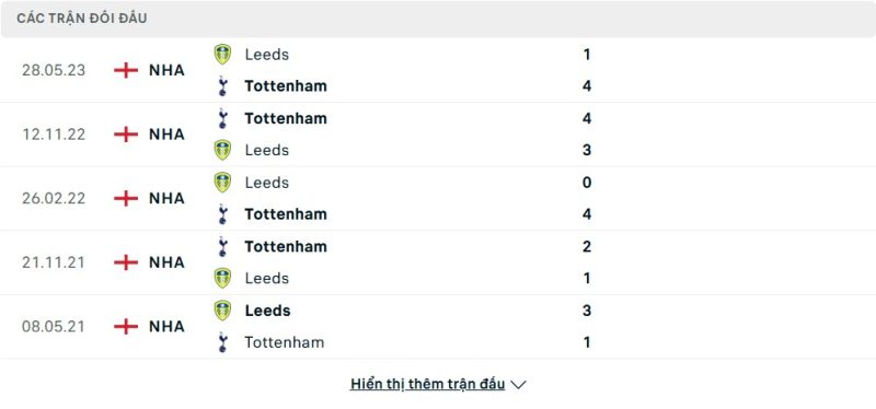 Thành tích đối đầu của Leeds United vs Tottenham Hotspur