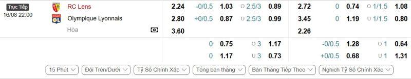 Bảng Tỷ lệ kèo bóng đá Lens vs Lyon