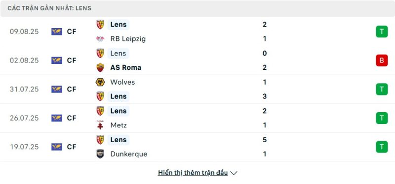 Lens đang có phong độ khá ổn định trong giai đoạn chuẩn bị cho mùa giải mới. Đội bóng này đã có những chiến thắng ấn tượng trước Leipzig, Metz và Wolves, cho thấy sức mạnh trên hàng công khi ghi được nhiều bàn thắng. Dù vậy, trận thua trước Roma và một vài trận hòa ở loạt giao hữu cũng cho thấy họ vẫn còn những điểm cần cải thiện ở hàng thủ. Lens bước vào vòng mở màn Ligue 1 2025/26 với sự tự tin lớn, đặc biệt khi được chơi trên sân nhà.