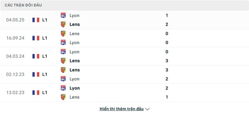 Thành tích đối đầu của Lens vs Lyon