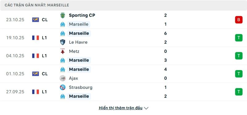 5 trận gần nhất của Marseille: L-W-W-W-W