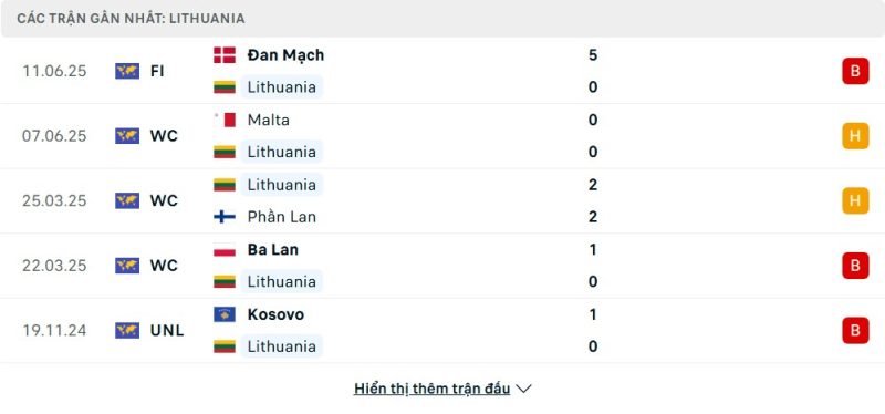 5 trận gần nhất của Lithuania: L-D-D-L-L