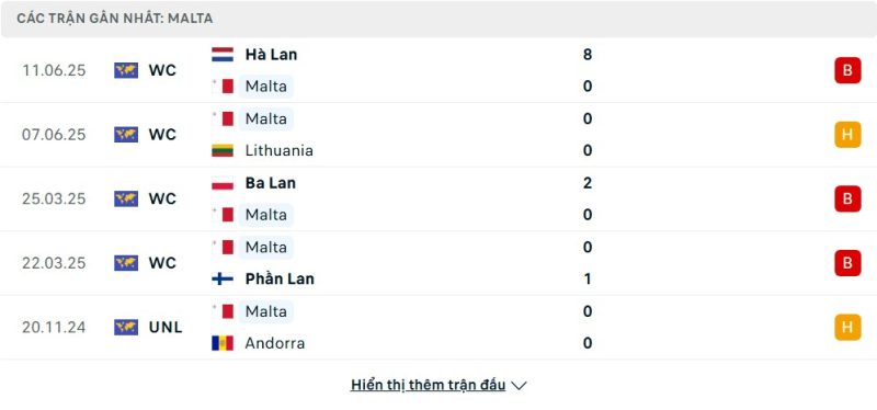 Bên kia chiến tuyến, Malta đang có một hành trình vòng loại thậm chí còn tệ hơn khi đứng cuối bảng với chỉ 1 điểm duy nhất sau 4 trận đã đấu. Điểm số này chính là từ trận hòa không bàn thắng với Lithuania trên sân nhà. Hàng thủ của Malta là một thảm họa thực sự khi đã để thủng lưới tới 11 lần, đỉnh điểm là thất bại kinh hoàng 0-8 trước Hà Lan. Đáng lo ngại hơn, hàng công của họ vẫn chưa một lần tìm thấy mành lưới đối phương sau 4 lượt trận, cho thấy sự bế tắc toàn diện.