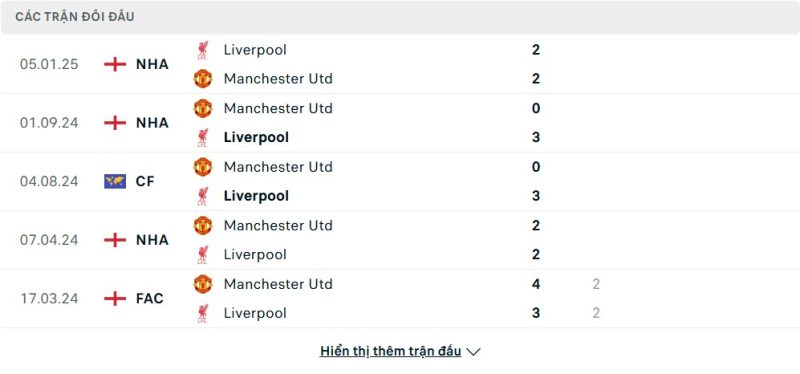 Thống kê phong độ gần đây Liverpool vs Manchester United