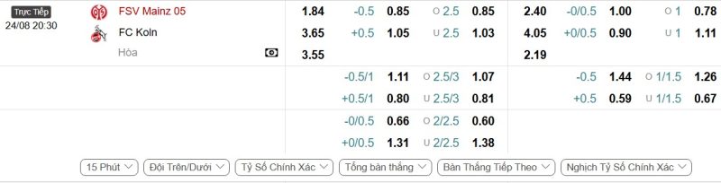 - Kèo tỷ số bóng đá hiệp 1: Mainz 05 2-0 Köln