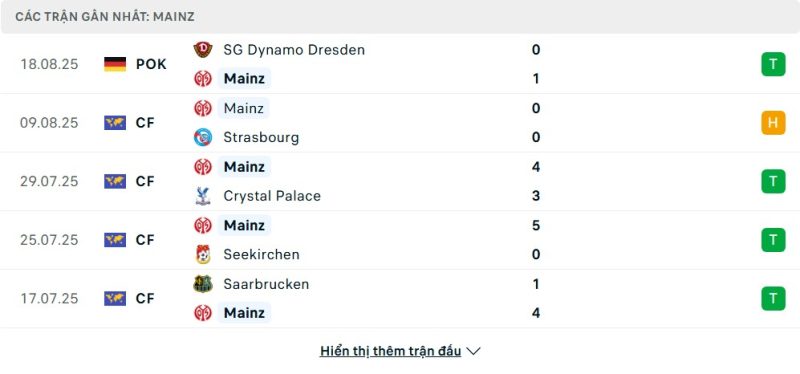 5 trận gần nhất của Mainz 05: W-D-W-W-W