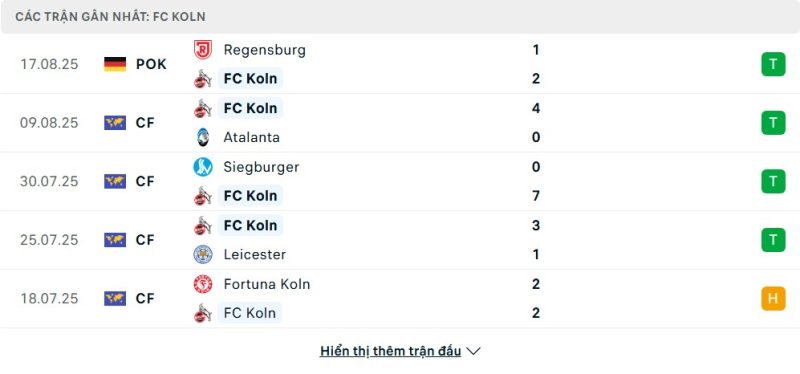 Köln đang hừng hực khí thế trở lại với giải đấu cao nhất nước Đức sau khi xuất sắc giành chức vô địch 2. Bundesliga mùa giải 2024/25. “Bầy dê” đã chứng minh rằng họ đã hoàn toàn sẵn sàng cho sự trở lại này bằng một chuỗi trận giao hữu hủy diệt. Họ thắng đến trận, trong đó có những chiến thắng đậm như 7-0 trước Siegburg hay 7-1 trước Bergisch Gladbach. Phong độ ghi bàn khủng khiếp này tiếp tục được thể hiện ở Cúp Quốc gia khi họ đánh bại Regensburg 2-1, khẳng định tham vọng sẽ tạo nên bất ngờ lớn ở mùa giải năm nay.