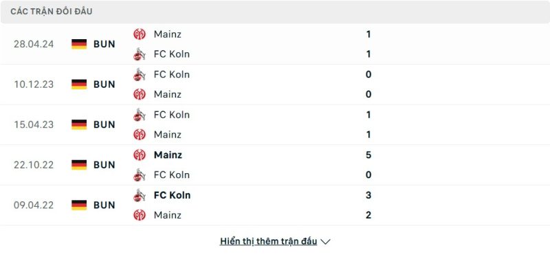Thống kê phong độ gần đây Mainz 05 vs Köln