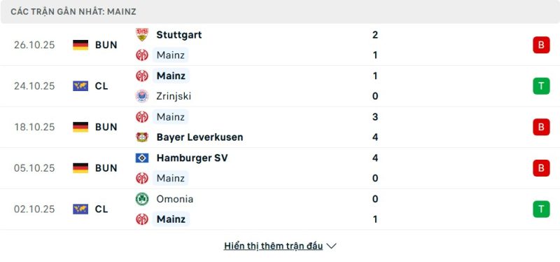 5 trận gần nhất của Mainz 05: L-W-L-L-W