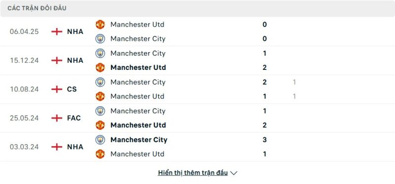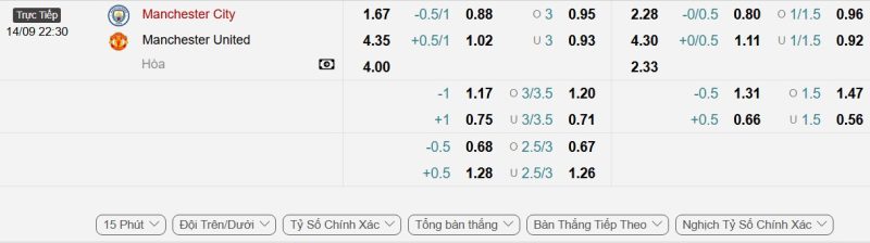 Bảng Tỷ lệ kèo bóng đá Manchester City vs Manchester United